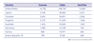전 세계에는 249개국 38,864개의 골프 코스가 있고 한국에는 800개가 넘는 골프 코스가 있습니다. 현재 세계에서 가장 빠른 속도로 성장하고 있는 나라는 한국으로 2016년 기준 골프 인구 480만 명이 2020년 약 600만 명으로 증가했습니다.